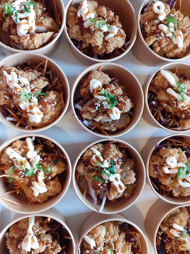 Poulet frit déposé sur son bol de riz sauté accompagné d’oignons grillés, œuf au plat coulant, sauce mayo ponzu,