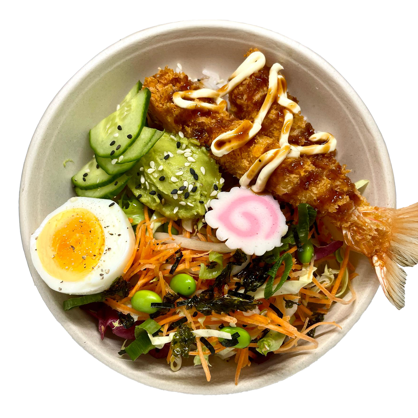 Crevettes croustillantes panées, posées sur du riz, avec carottes râpées, concombre, naruto, demi-œuf mariné, sauce mayonnaise