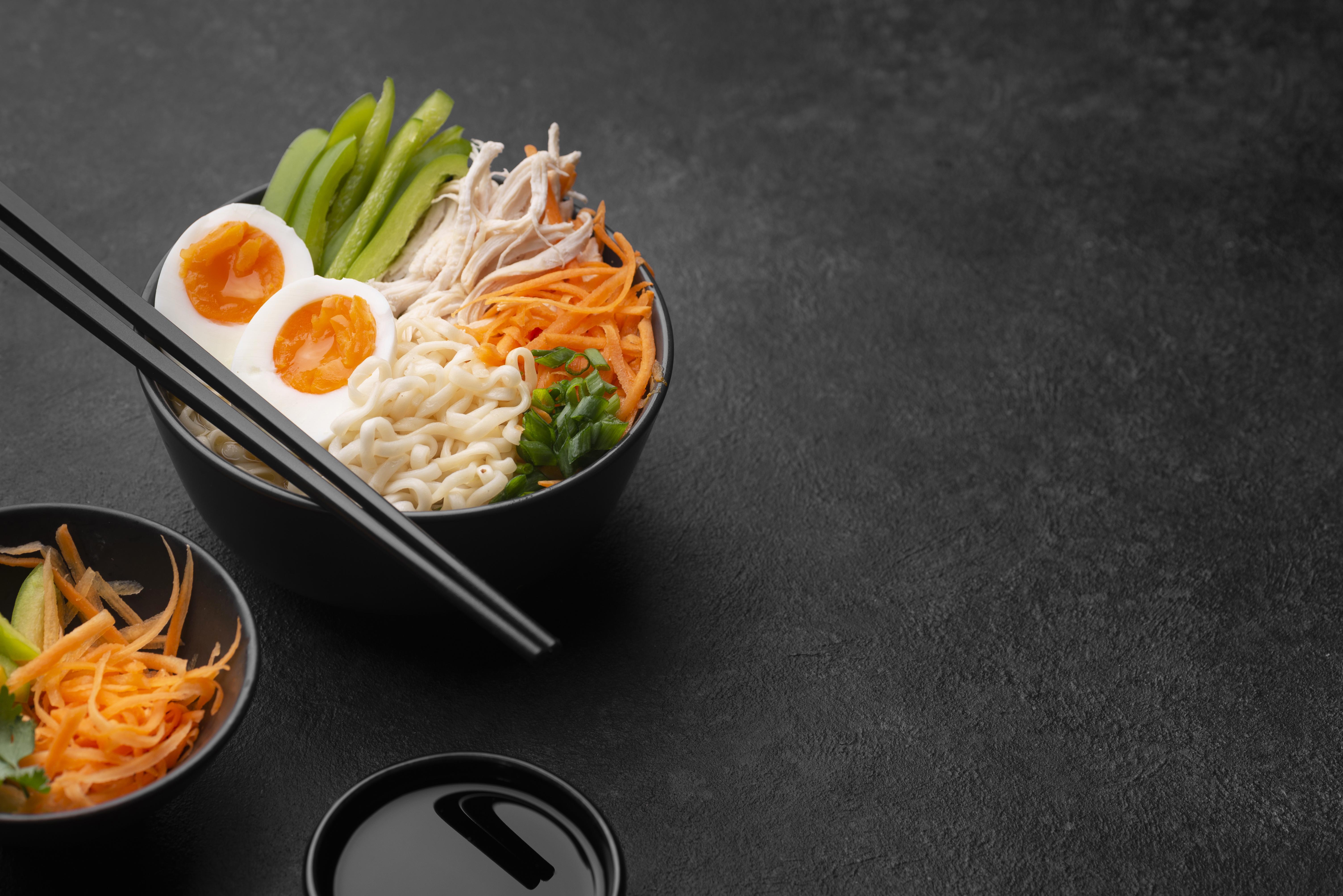 NOUILLES, POUSSES DE SOJA, œuf, épices, accompagné de légumes, ainsi qu’un Délicieux bouillon