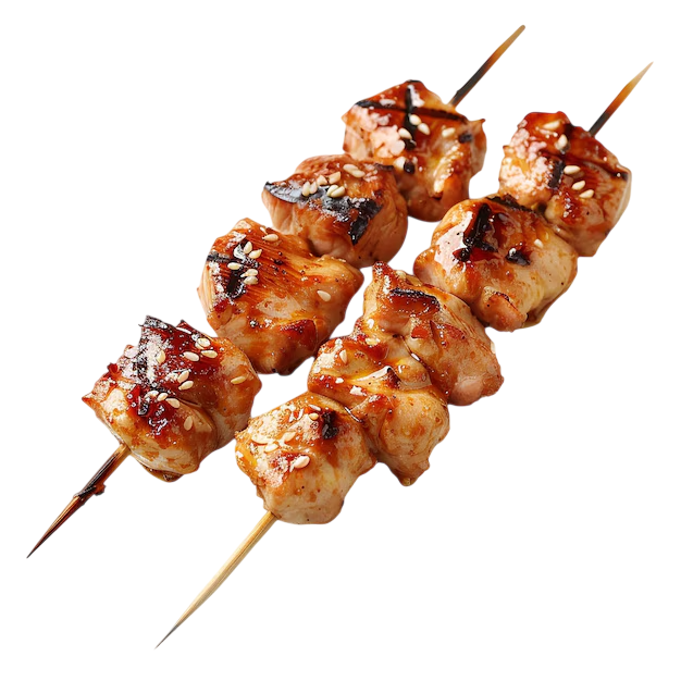 morceaux de volailles marinés dans une sauce sucrée salée, en brochette